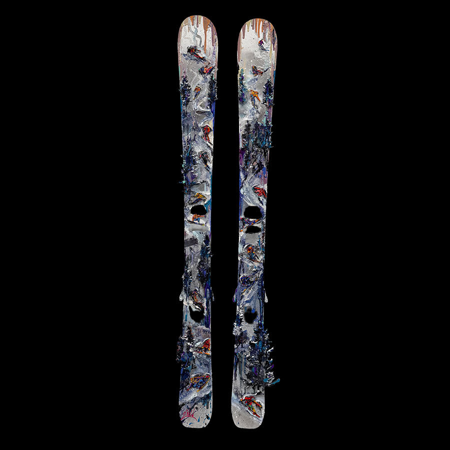 "Frozen Rhythm" by 2Wild is a collaboration by brother and sister artist duo Barak and Miri Rozenvain. This original mixed-media painting measures 59" tall by 6" wide for each ski. Each ski is the same length and at their widest points measure 6" across. With spacing the skis are approximately 17" wide.