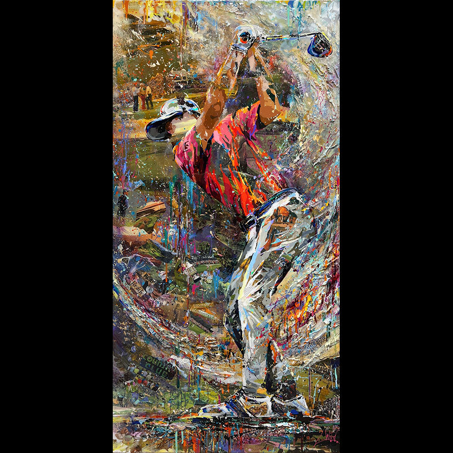 "In Full Swing" by 2Wild is a collaboration by brother and sister artist duo Barak and Miri Rozenvain. This original mixed-media painting measures 60" tall by 30" wide. It is created with collage, Acrylic and resin on panel.