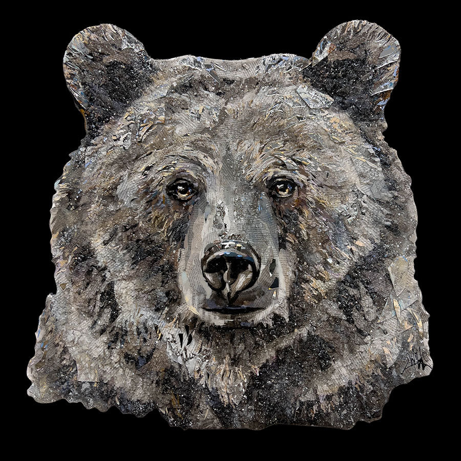 "Reflections of Majesty" by 2Wild is a collaboration by brother and sister artist duo Barak and Miri Rozenvain. This original mixed-media painting measures 42" tall by 42" wide. The piece is created with mixed media collage and shattered glass on wood panel.