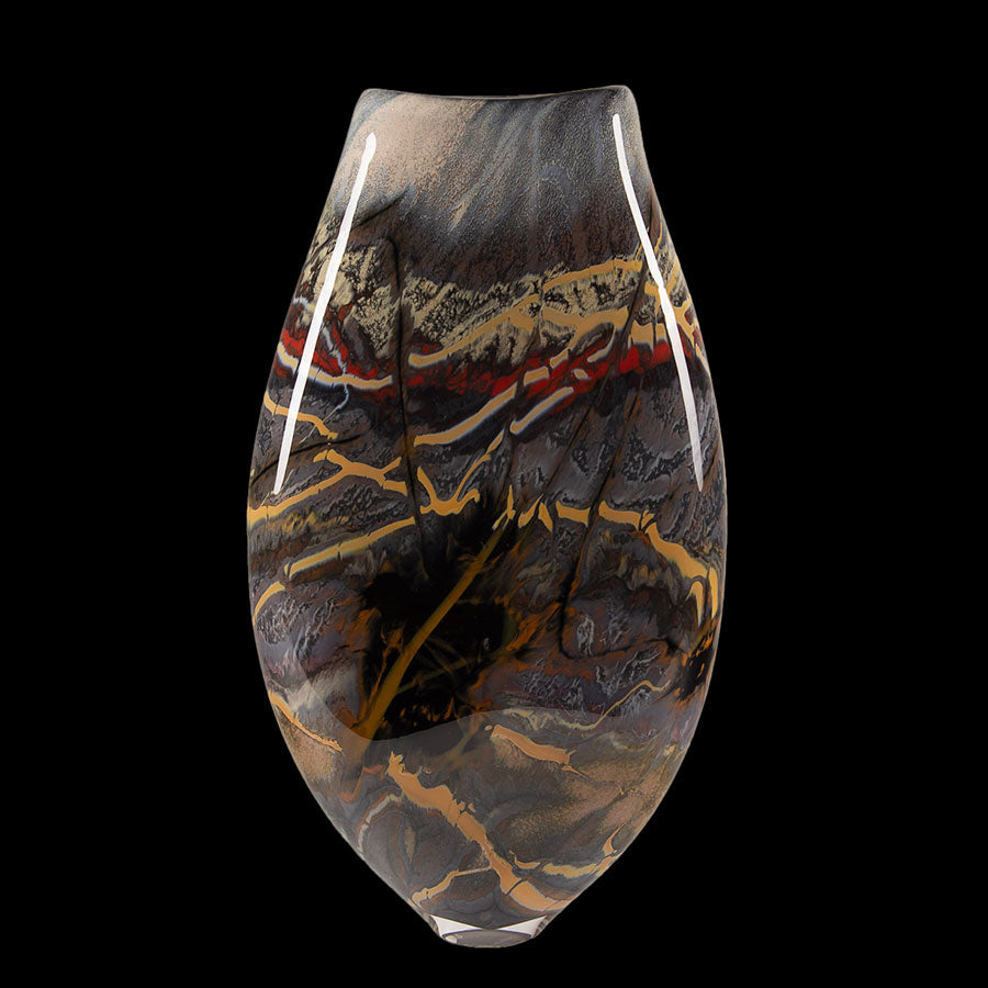 "Canyon Walls - Black" by Jared & Nicole Davis measures 17.5 inches tall by 9 inches wide by 3 inches deep. This one-of-a-kind piece is made of hand-blown glass.
