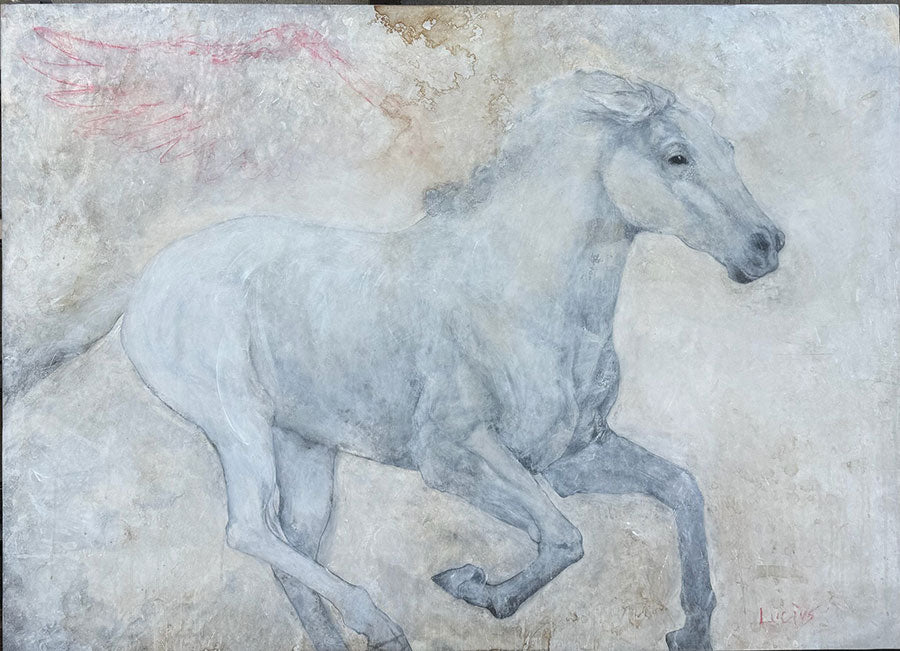 "Horse with Red Wing" is an original gesso and ink on panel painting by Lex Lucius and measures 48" tall by 67" wide. Interestingly, Lucius creates most of his work with a rag. Often hidden within the many layers of his paintings are symbols, words and more marks to add a conceptual element to the art.