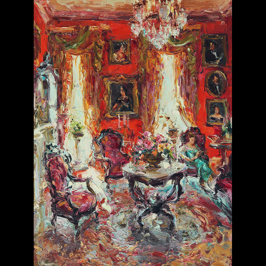 "Lost in History" is an original oil on canvas media painting by the Denver, Colorado-based artist Lyudmila Agrich. The painting measures 40" tall by 30" wide.