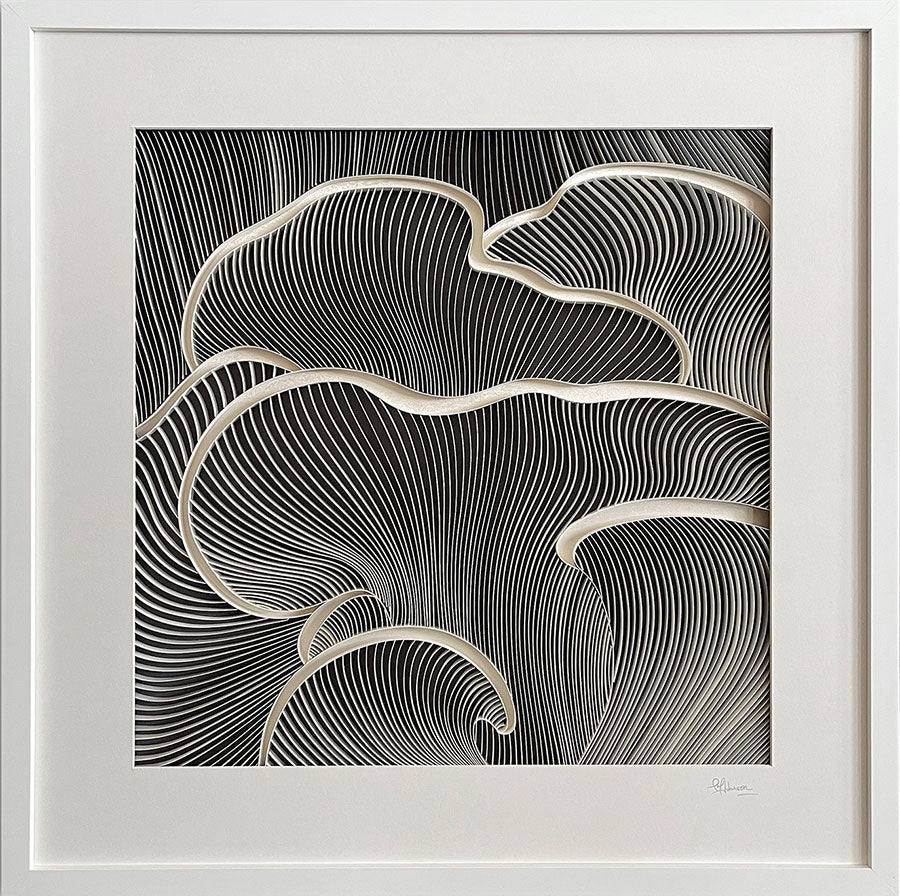 Paulina creates each three-dimensional piece by flipping carefully selected paper onto its edge, forming representational works intricately designed to form portraits of nature.