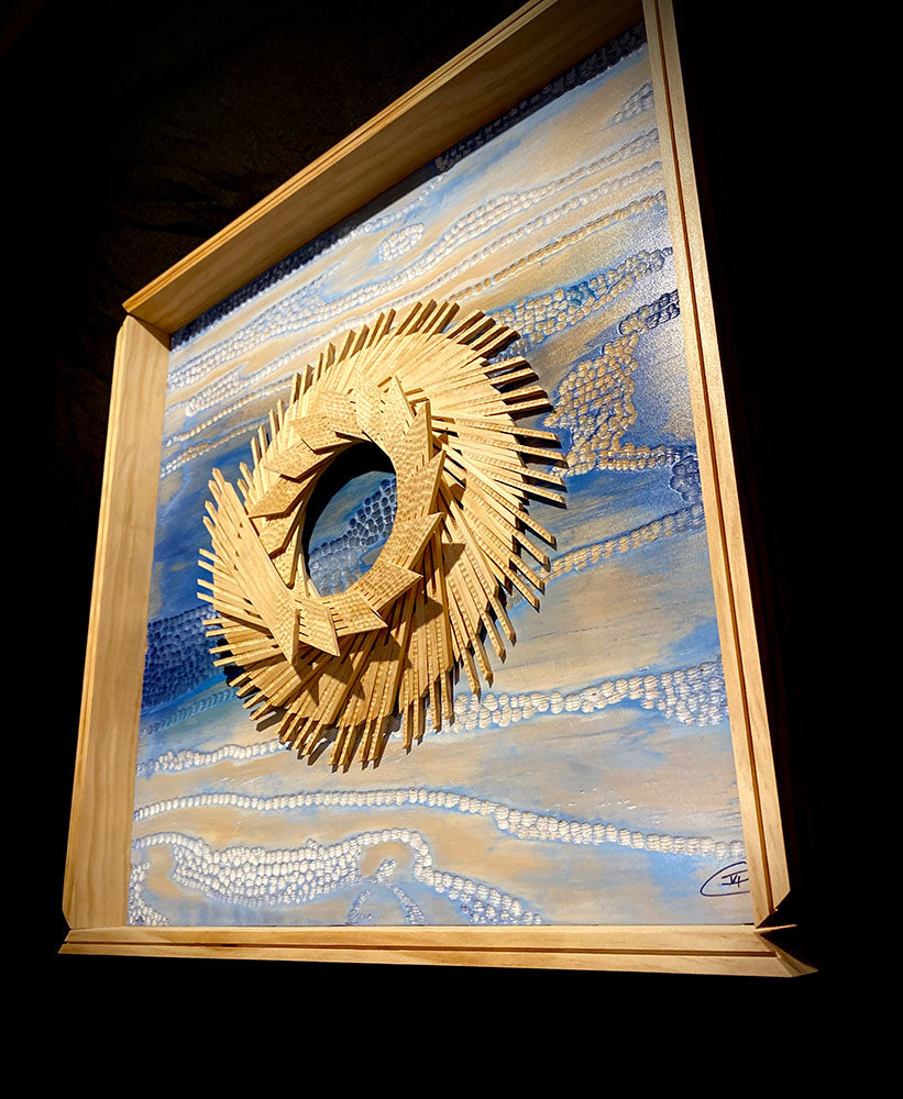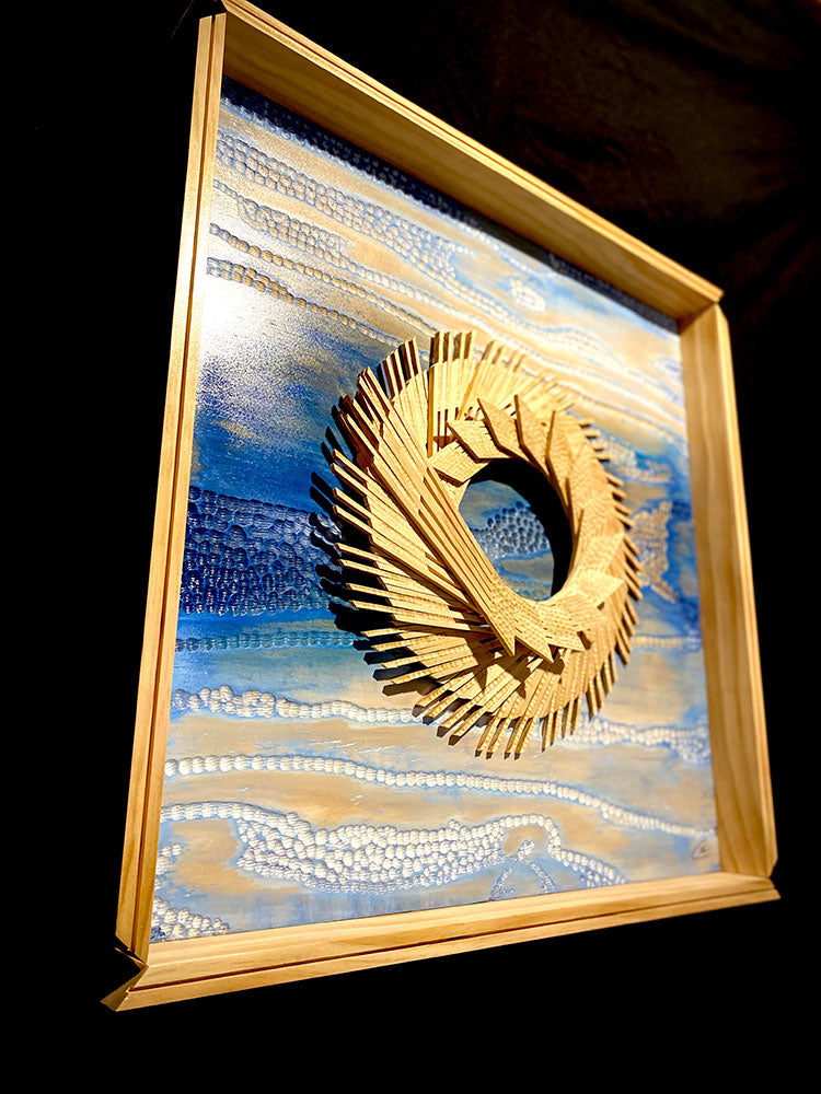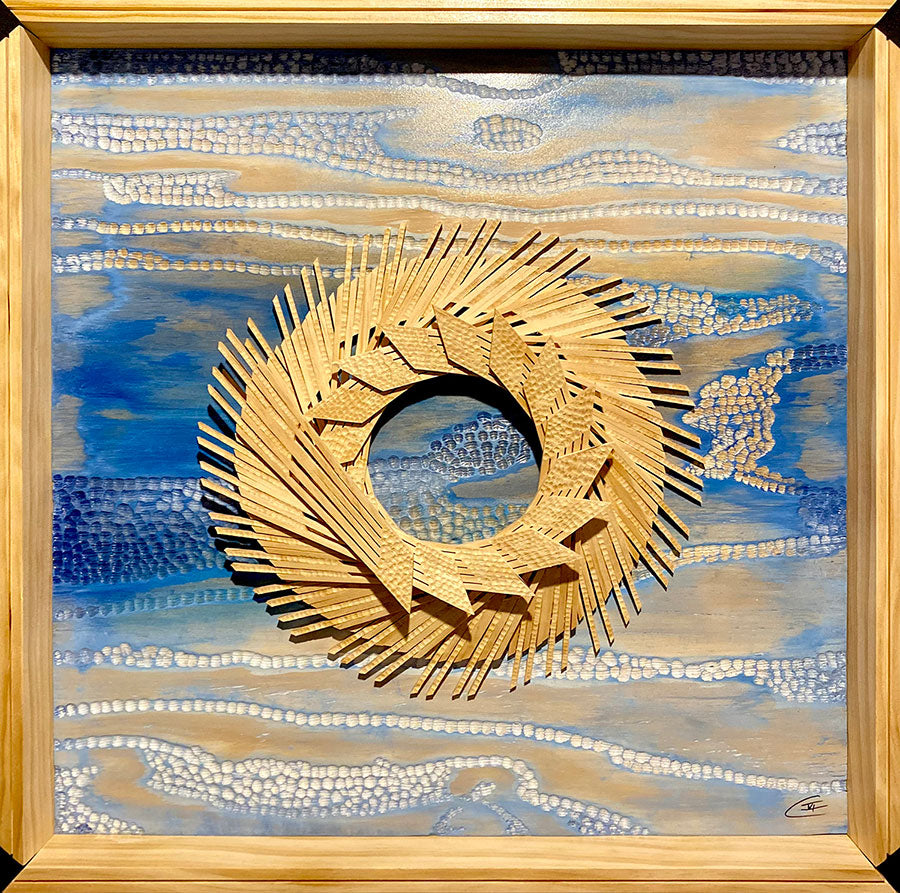 "Sea Breeze" by Cie Hoover is an original mixed media on wood piece that measures 25" tall by 25" wide.  The frame size is 27" tall by 27" wide.  After creating a "wood canvas" Cie utilizes various routers, saws, and stains to create his artwork.