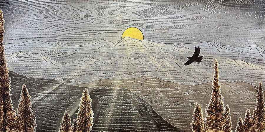 "Solitude" by Cie Hoover is an original mixed media on wood piece that measures 24" tall by 48" wide.   After creating a "wood canvas" Cie utilizes various routers, saws, and stains to create his artwork.