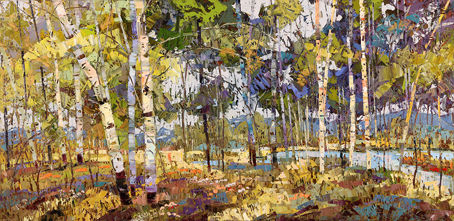 "Through the Trees" by Robert Moore measures 24 inches tall by 48 inches wide. It depicts the spring colors of Aspen trees within the Rocky Mountains.