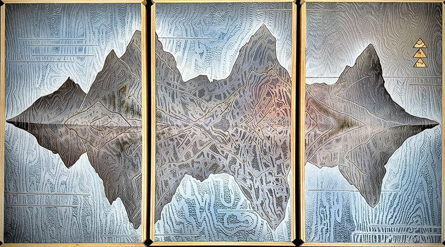 "Echo" by Cie Hoover is an original triptych mixed media on wood piece that measures 49" tall by 75" wide. After creating a "wood canvas" Cie utilizes various routers, saws, and stains to create his artwork.