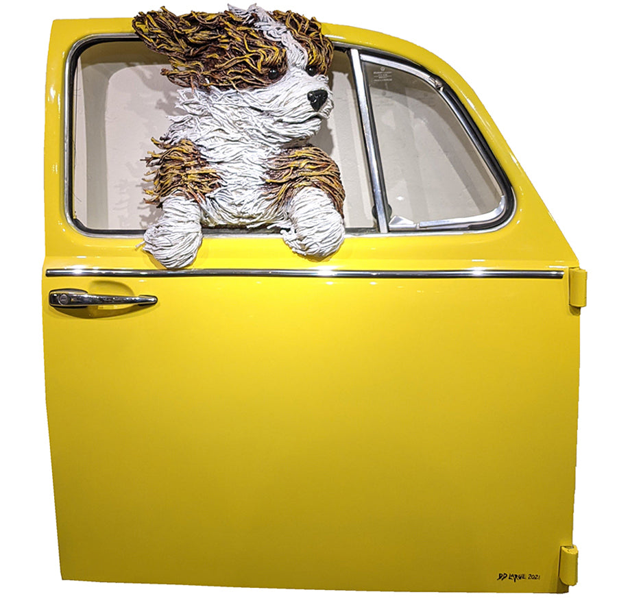 "Sheepdog in a Yellow VW Door" by DD LaRue is part of the artist's signature dog in a Volkswagon Beetle door series. The door comes from a pre-1974 VW Beetle Door (typically between 1959 and 1973). The sculpture is made of mixed-media, including string, fiberglass, polyurethane, Bondo, and more.