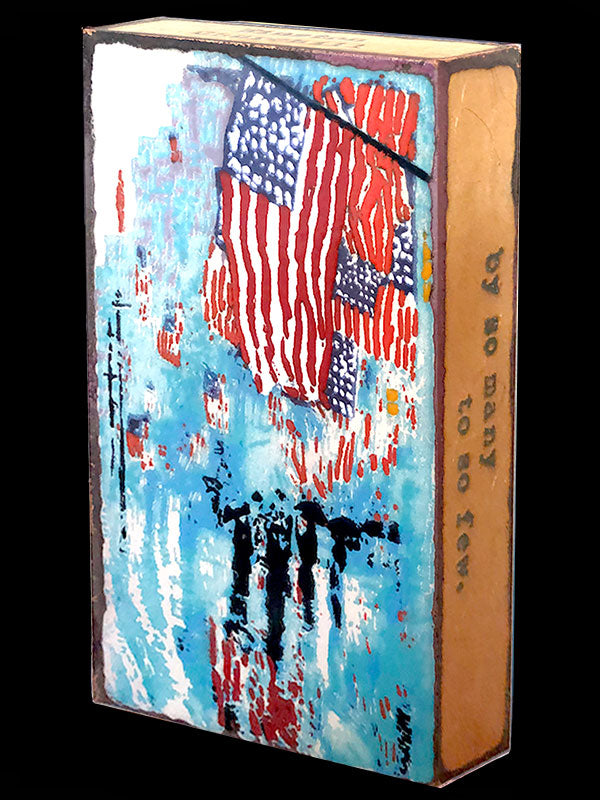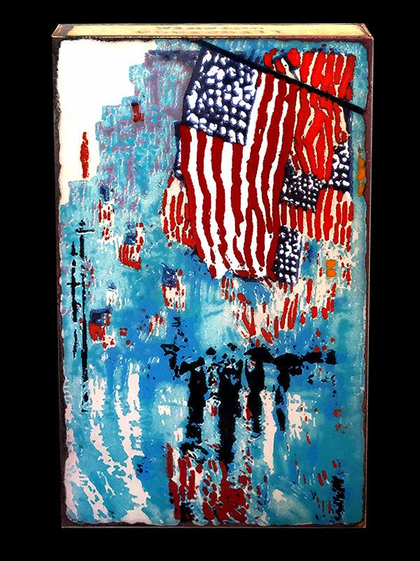 This piece is a somewhat modern yet timeless enameled interpretation of Childe Hassam’s 1917 painting “Avenue in the Rain.” The original painting is in the permanent art collection of the White House and has graced the Oval Office over several recent presidencies. It is one of my favorite patriotic pieces ever created.