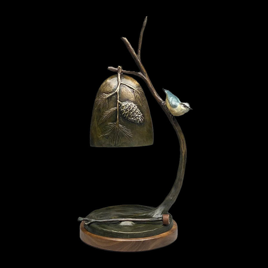 "Nuthatch Glissando" was created by Colorado Artist James G. Moore. This magnificent piece doubles as a sculpture and a bell. It is made out of bronze and measures 14" x 7" x 7".