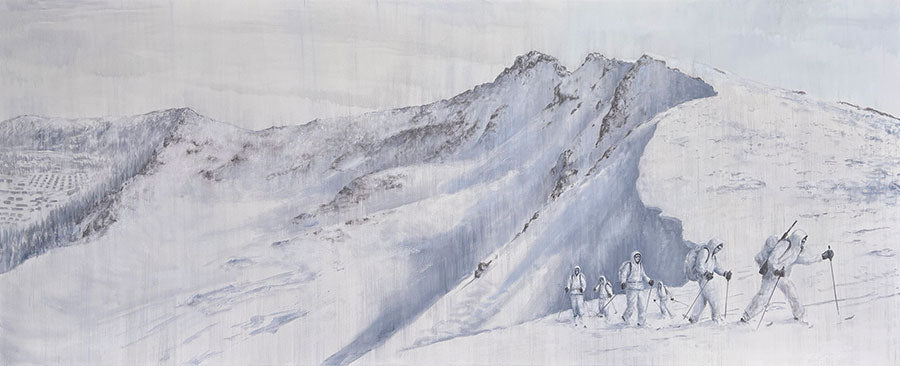 "Machinegun Range" is an original oil painting by Jared Hankins, measuring 40 inches tall by 100 inches wide.