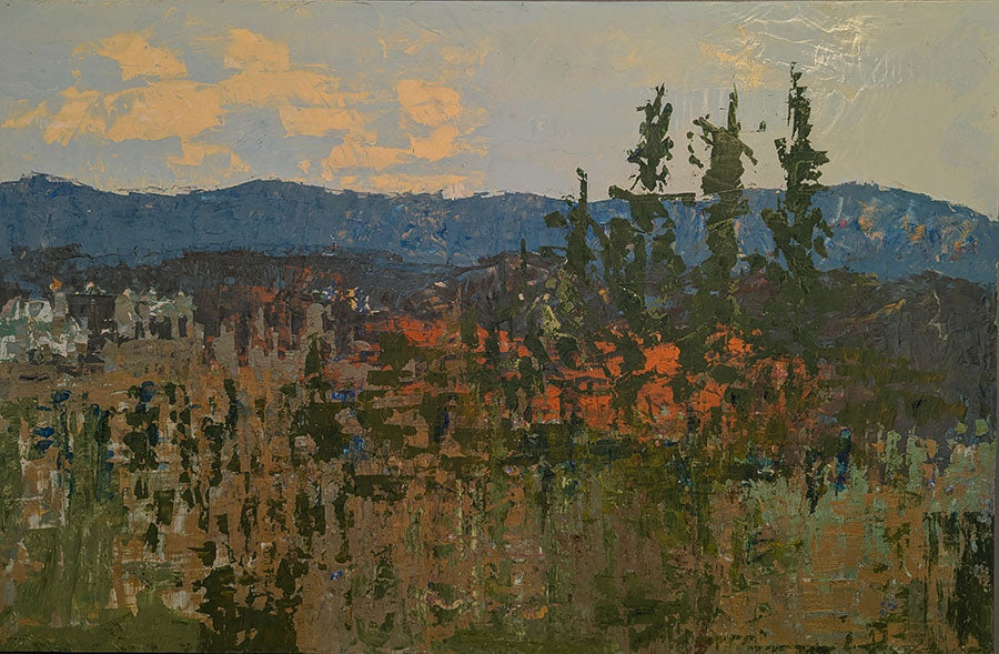 "Lovely Day" by Kristof Kosmowski is a one-of-a-kind oil and Venetian plaster painting on hand-built wood panel. The piece measures 31" tall by 47" wide.