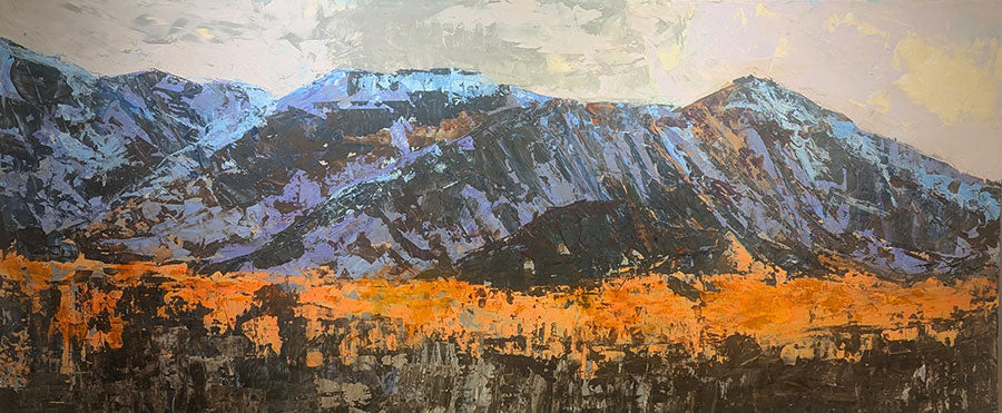 "Nature's Harmony" by Kristof Kosmowski is a one-of-a-kind oil and Venetian plaster painting on hand-built wood panel. The piece measures 23.75" tall by 55.25" wide.