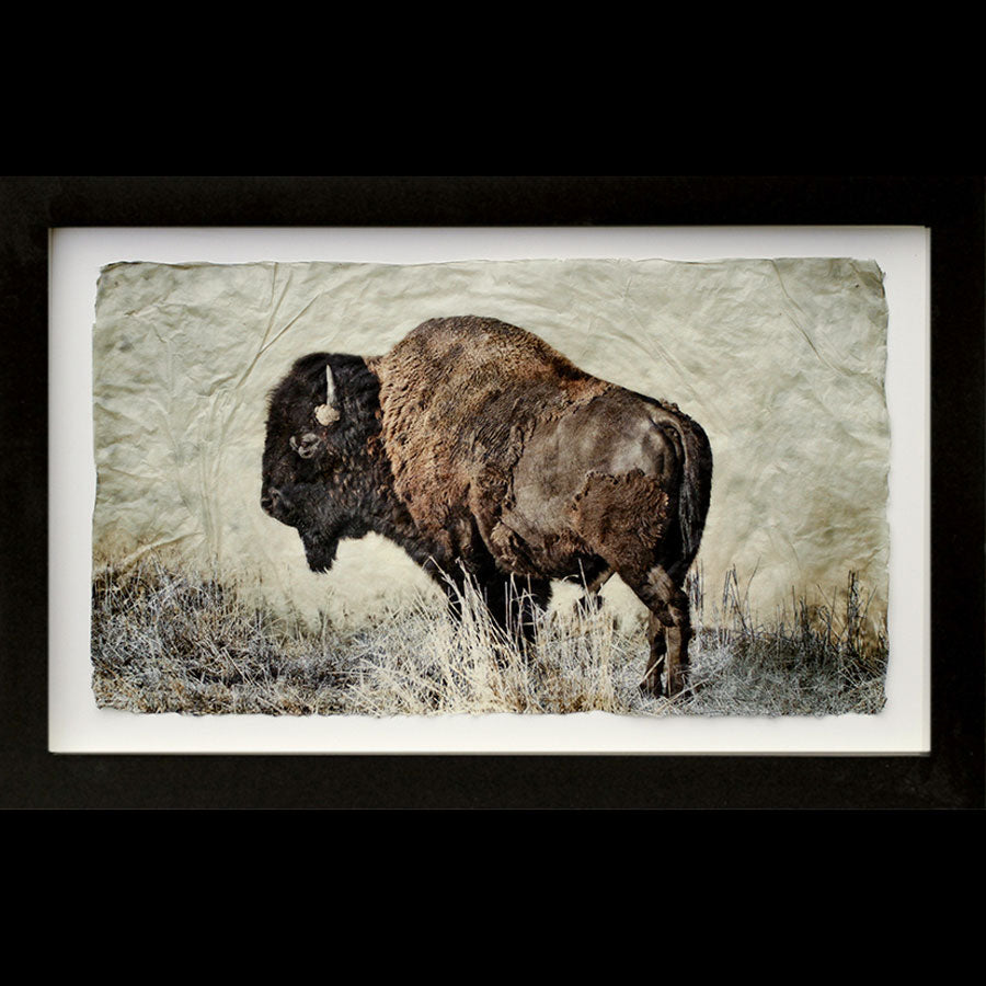 "Lotta Bull" is created in Pete Zaluzec's signature "Gampi" medium. After editing the background out of the image, Zaluzec prints two versions of the image. He overlays the images with a slow-drying adhesive and allows them to dry, shrink and create ridges .He further modifies the papers to create the final image, before custom-framing each piece. Each image comes in editions of 45 and is available in three sizes. Every Pete Zaluzec image is custom framed in black, off-white or barn wood.