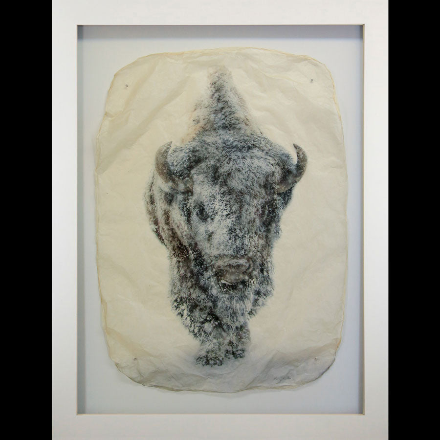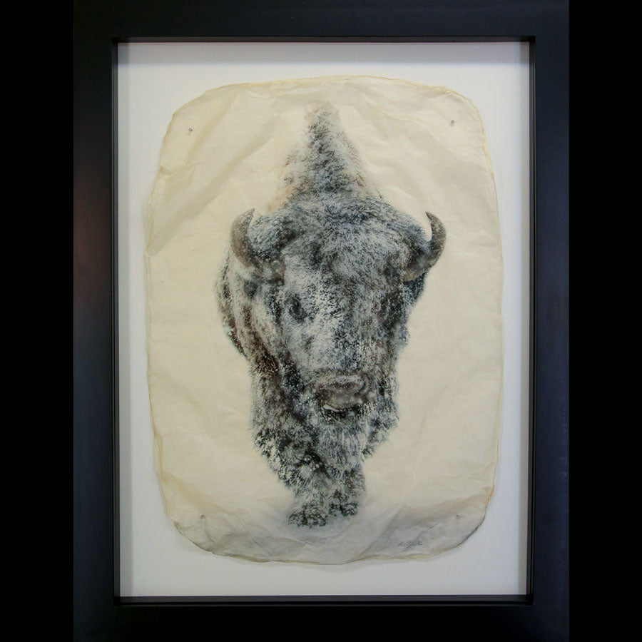 This is created in Zaluzec's signature "Gampi" medium. After editing the background out of the image, Zaluzec prints two versions of the image. He overlays the images with a slow-drying adhesive and allows them to dry, shrink, and create ridges. He further modifies the papers to create the final image, before custom-framing each piece. Each image comes in editions of 45 and is available in two sizes. Every Pete Zaluzec image is custom framed in black, off-white, or barn wood.