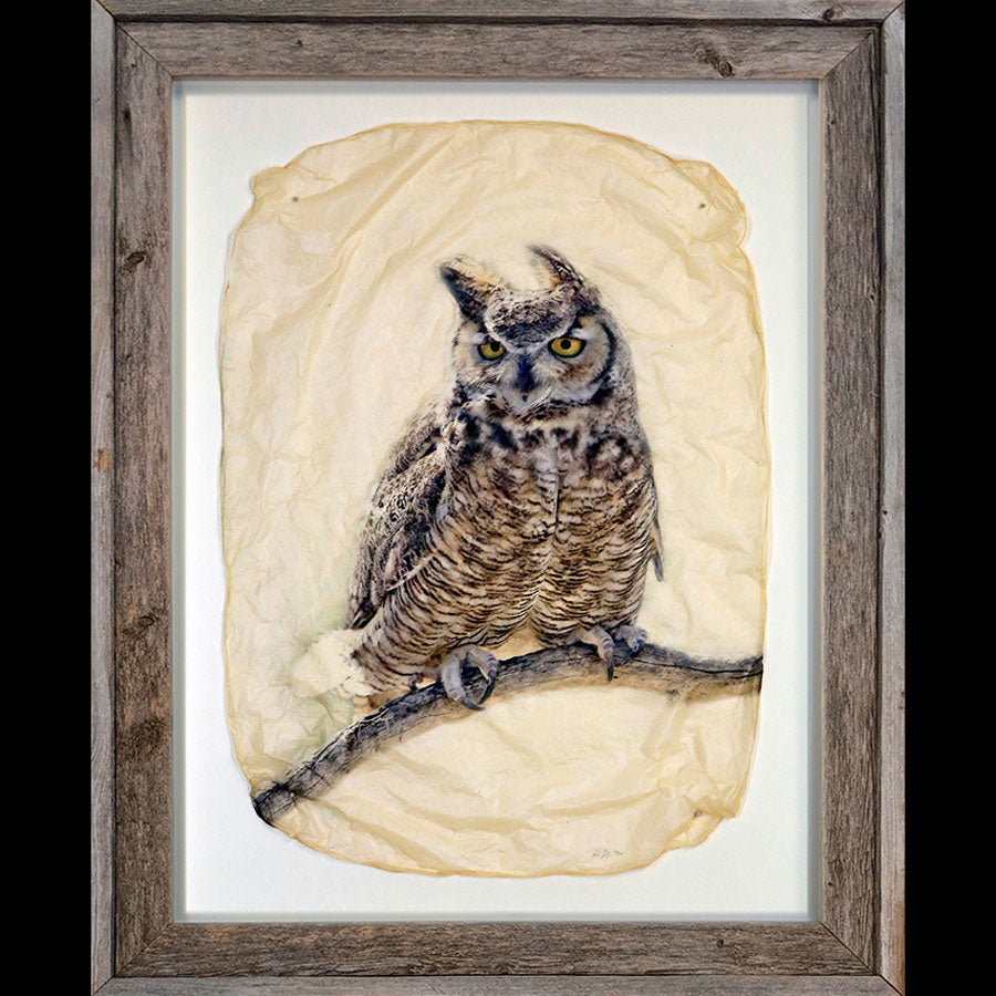 This is created in Zaluzec's signature "Gampi" medium. After editing the background out of the image, Zaluzec prints two versions of the image. He overlays the images with a slow-drying adhesive and allows them to dry, shrink, and create ridges. He further modifies the papers to create the final image, before custom-framing each piece. Each image comes in editions of 45 and is available in two sizes. Every Pete Zaluzec image is custom framed in black, off-white, or barn wood.