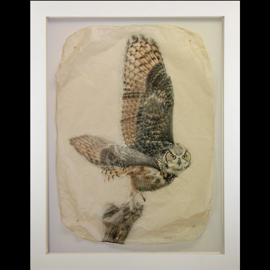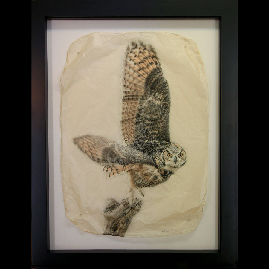This is created in Zaluzec's signature "Gampi" medium. After editing the background out of the image, Zaluzec prints two versions of the image. He overlays the images with a slow-drying adhesive and allows them to dry, shrink, and create ridges. He further modifies the papers to create the final image, before custom-framing each piece. Each image comes in editions of 45 and is available in two sizes. Every Pete Zaluzec image is custom framed in black, off-white, or barn wood.