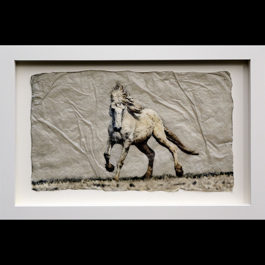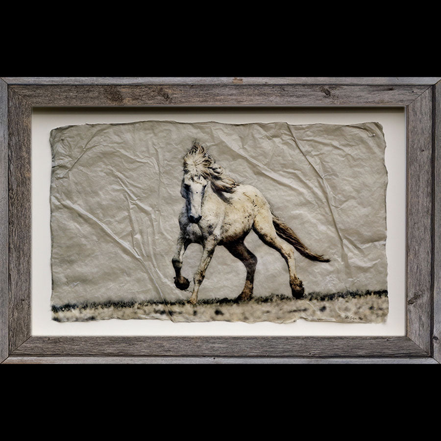 This is created in Zaluzec's signature "Gampi" medium. After editing the background out of the image, Zaluzec prints two versions of the image. He overlays the images with a slow-drying adhesive and allows them to dry, shrink, and create ridges. He further modifies the papers to create the final image, before custom-framing each piece. Each image comes in editions of 45 and is available in two sizes. Every Pete Zaluzec image is custom framed in black, off-white, or barn wood.