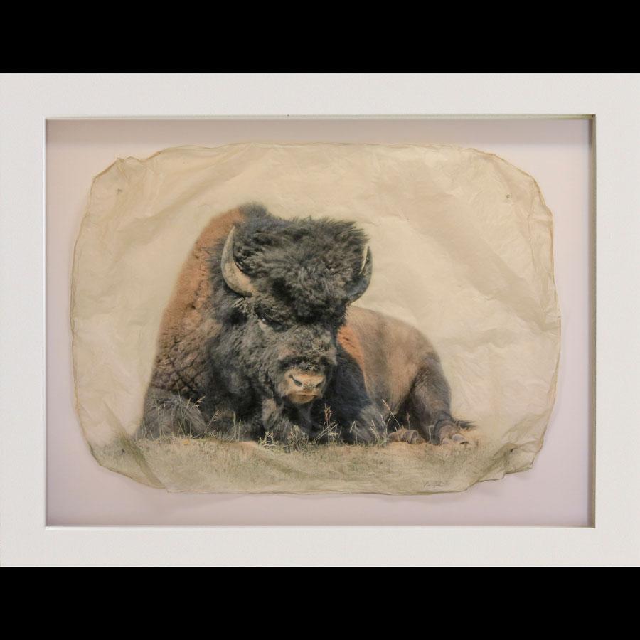 This is created in Zaluzec's signature "Gampi" medium. After editing the background out of the image, Zaluzec prints two versions of the image. He overlays the images with a slow-drying adhesive and allows them to dry, shrink, and create ridges. He further modifies the papers to create the final image, before custom-framing each piece. Each image comes in editions of 45 and is available in two sizes. Every Pete Zaluzec image is custom framed in black, off-white, or barn wood.