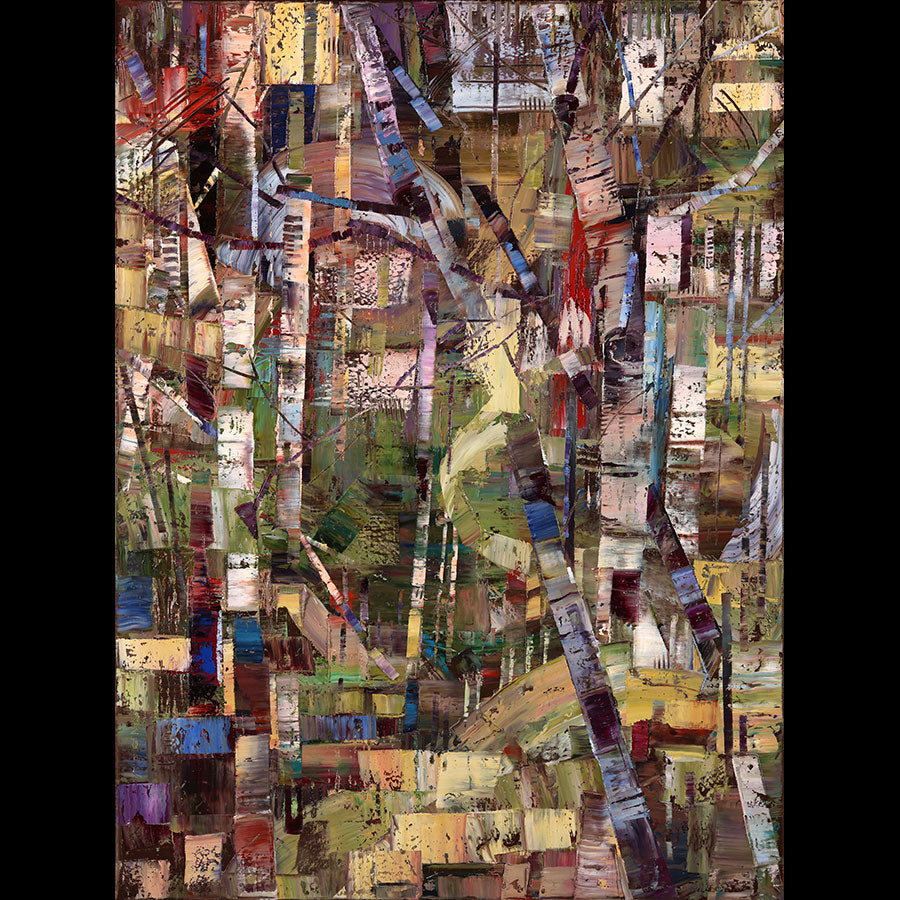 "Summer" by Robert Moore measures 48 inches tall by 36 inches wide. It as abstract depiction of the summer colors of Aspen trees within the Rocky Mountains.