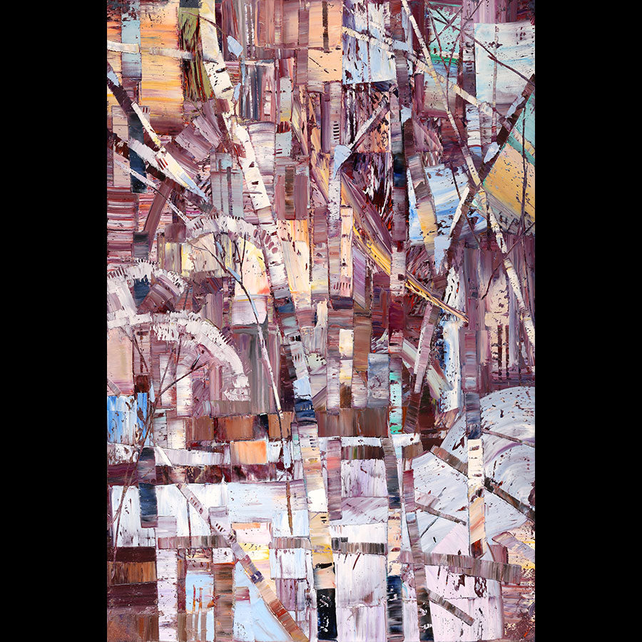 "Winter" by Robert Moore measures 48 inches tall by 36 inches wide. It as abstract depiction of the summer colors of Aspen trees within the Rocky Mountains.