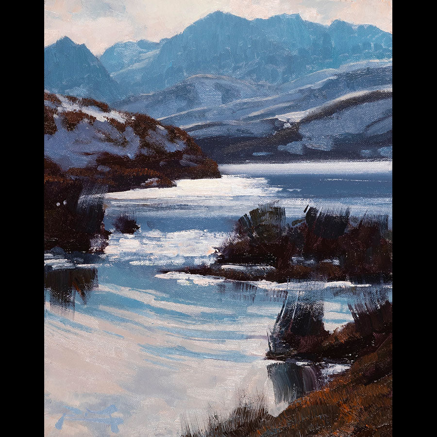 "Blinding Light" by Robbie Moore measures 8 inches tall by 10 inches wide. It is a smaller study done before a larger full sized painting. Robbie is Robert Moore's son, an exceptional impressionist painter. The piece is framed in a hand built frame made in Robbie's studio.