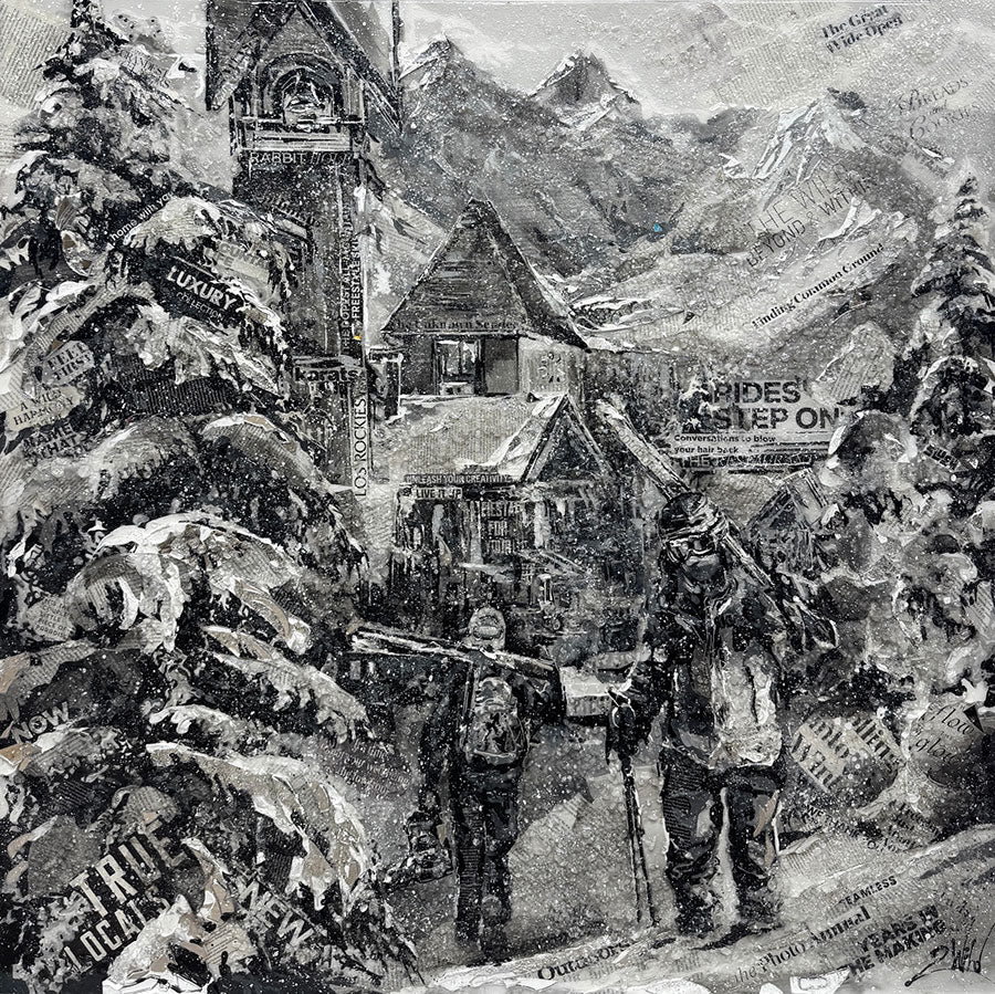 "Evening in Vail" by 2Wild is a collaboration by brother and sister artist duo Barak and Miri Rozenvain. This original mixed-media painting measures 48" tall by 48" wide. The piece is created with Acrylic painting, media collage, mirror fragments, shattered glass, diamond dust, and resin on wood panel. The effect is incredible in person, as the light in the painting moves as you move past it and it changes dramatically as the light in the room changes.