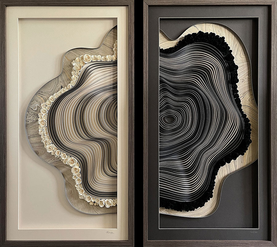Paulina creates each three-dimensional piece by flipping carefully selected paper onto its edge, forming representational works intricately designed to form portraits of nature.