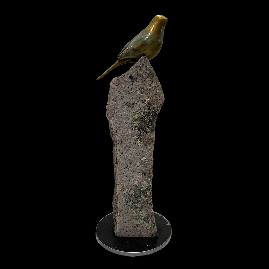 "Songbird Fulfilled" by Gilberto Romero is a one-of-a-kind bronze and stone sculpture. It measures 13 inches tall by 5 inches wide and 5 inches deep. The sculpture is custom-fabricated bronze and stone. This piece is designed for either indoor or outdoor use.